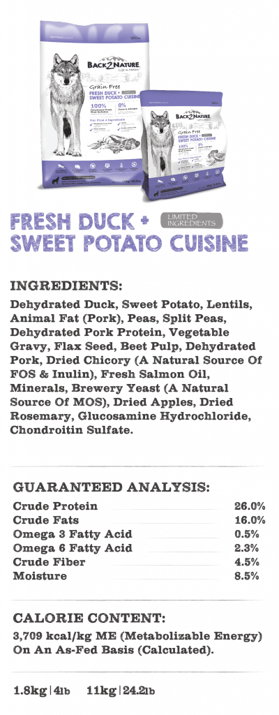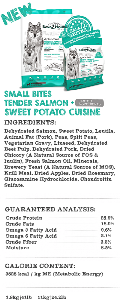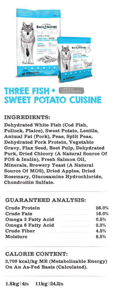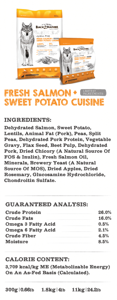 BACK2NATURE, Life In Motion Diet. Mimics the ancestral diet of canines as nature intended. Our diet includes dehydrated fresh meats or fish being the first ingredients which provides 400% more meat protein; all gently dried without exposure to high temperature to preserve the natural nutrients within the food. All combined with healthy fats with low-glycemic vegetable like lentils and sweet potato!